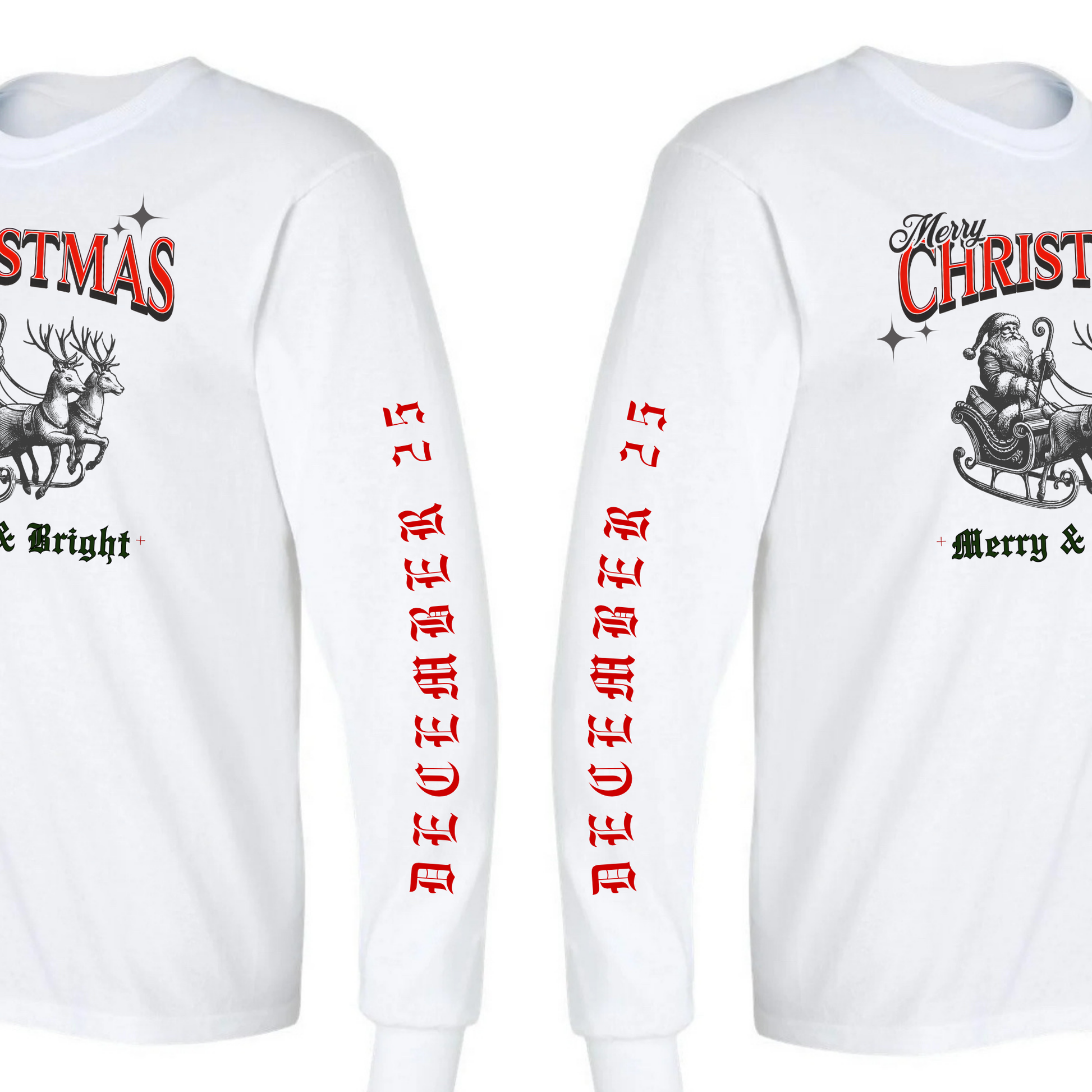 This shirt stands out from our short sleeve option as it features 'December 25th' in a striking red print that runs down the sleeve. Options available in left sleeve print or right sleeve print!